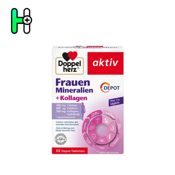 مکمل مواد معدنی زنان+کلاژنمواد معدنی زنان+کلاژن دوپل هرز + Kollagen ترکیبی از مواد معدنی، کلسیم، فولیک اسید و کلاژن هیدرولیز شده است که به تقویت استخوانها، پوست، مو، ناخن و سیستم ایمنی بدن زنان کمک میکند. این محصول بهصورت DEPOT طراحی شده، که به آزادسازی تدریجی مواد مغذی در بدن کمک کرده و تأثیر طولانیتری دارد